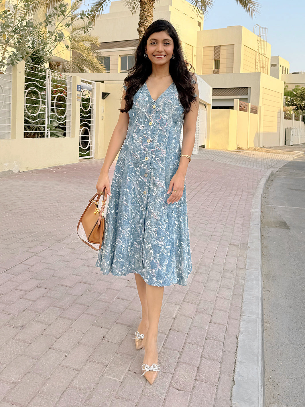 This one’s for the free spirits with a taste for structure. House of Fett presents a sleeveless, collared denim shirt dress featuring an all-over bird print that feels like flight stitched in blue. Designed with princess seams for an hourglass shape and a flared hemline that dances as you move, this piece fuses soft energy with strong tailoring. The sharp V-neck and button-down closure add crispness, while the whimsical print and fluid silhouette bring softness to your every step.