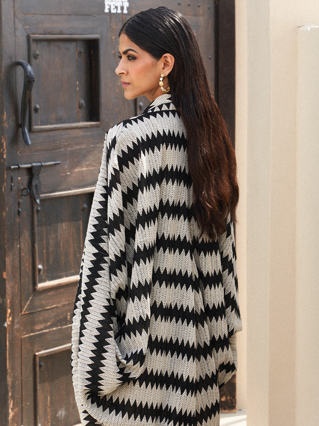 This geometric open-front crochet jacket by House of Fett features a bold black-and-ivory zigzag weave with a shawl collar and cocoon-style drape. Voluminous yet lightweight, it adds striking texture and movement to neutral separates. Perfect for pairing with a swimsuit or bikini and super chic beachside looks!