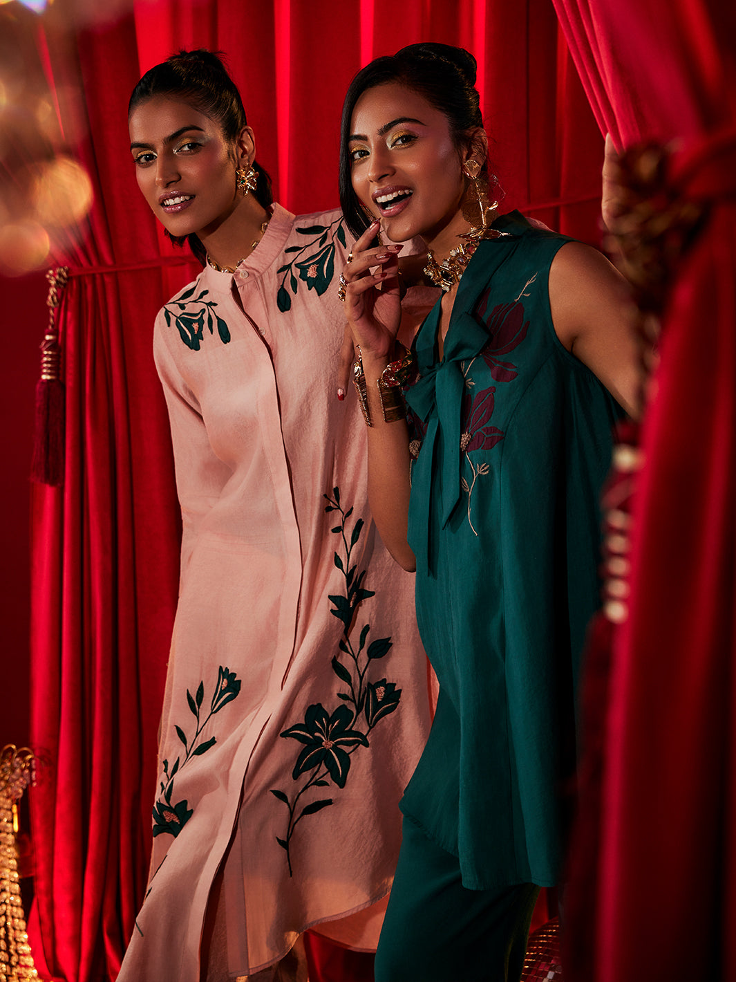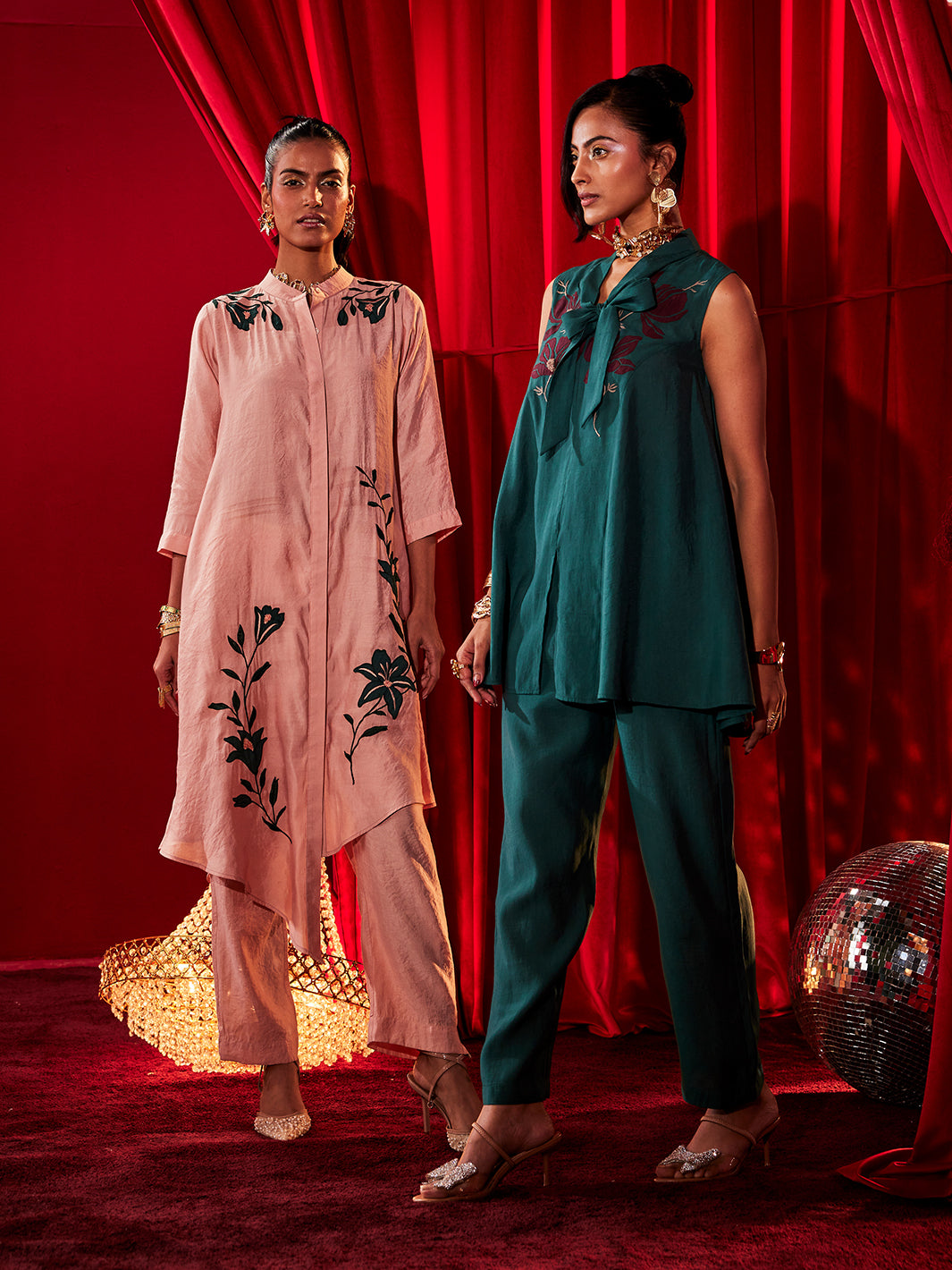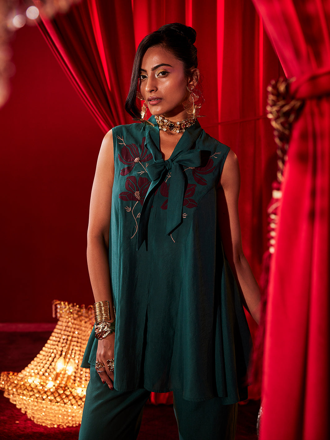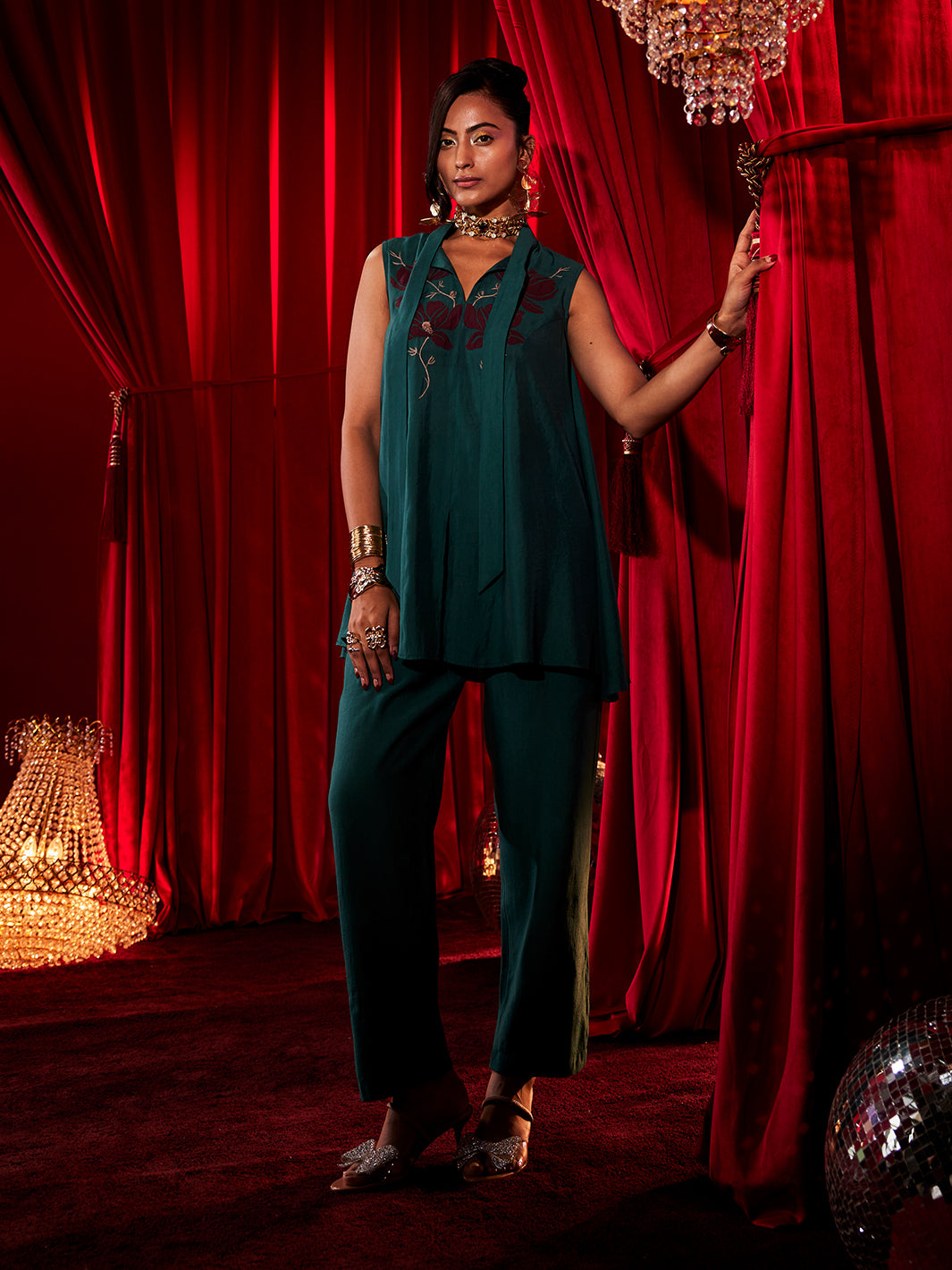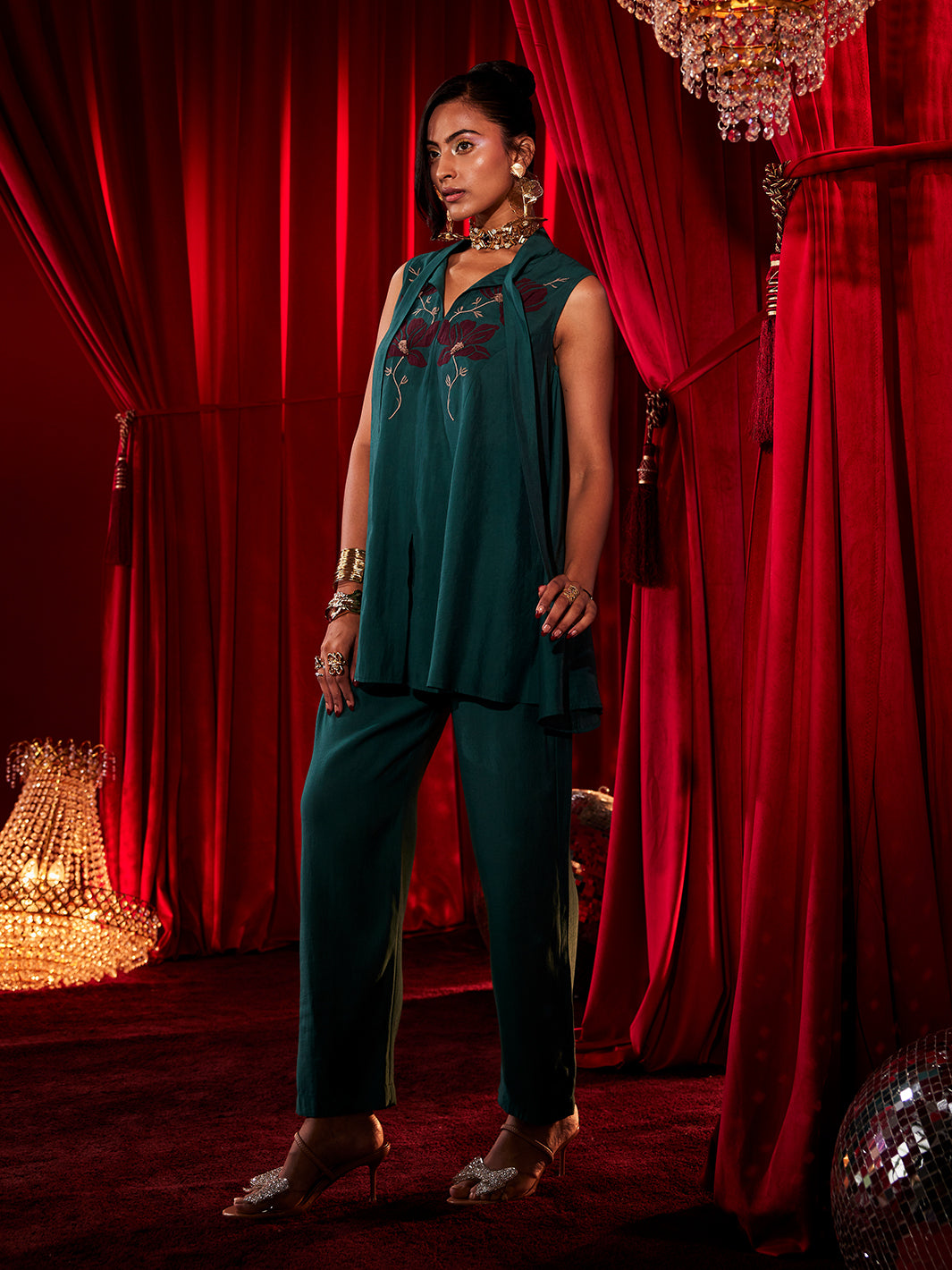 Defined by effortless sophistication, this coord set brings a modern edge to festive dressing with its sleeveless tunic and relaxed trousers. The deep teal hue is elevated by contrast floral embroidery, giving the surface a textured, handcrafted finish. Cut in a free-flowing silhouette, the tunic drapes beautifully over the body, with a tie-detail neckline adding a touch of refinement. The layered front fall introduces movement, creating a graceful flow with every step, while the easy trousers complete the look with understated polish.