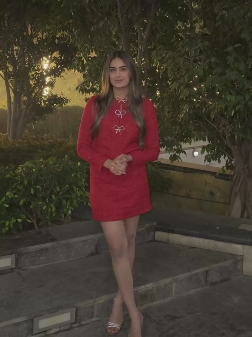 This striking Red dress is perfect for looking chic and festive. It is made from a rich, textured tweed fabric in a bold red color. Tweed is known for its classic woven, slightly bumpy texture, which makes this piece feel substantial and luxurious, and it has a little bit of shimmer woven in. It features a simple round neck and long sleeves, with the hem landing around mid-thigh. The best part is the three sparkly rhinestone bows down the front! The back has a small, tidy pleat and a little keyhole opening at the neck for easy wearing. Keep in mind that the color might look slightly different in person than in the pictures because of the studio lighting.