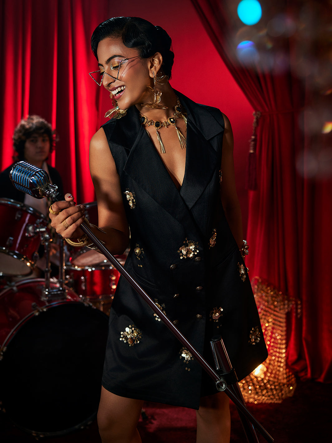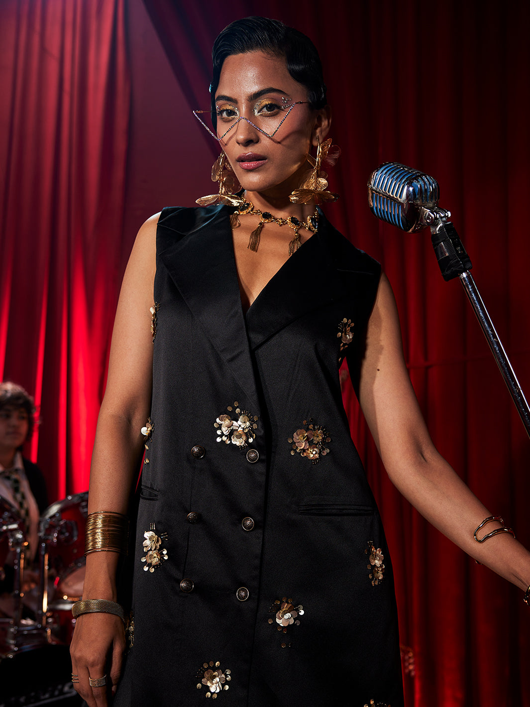 A power piece for the modern wardrobe, this black sleeveless dress channels tailored sophistication with a hint of sparkle. The double-breasted front and sharp lapel collar add a structured edge, while delicate hand-embroidered floral embellishments bring a touch of femininity. Designed to be worn as a dress or styled as a longline vest, this piece transitions effortlessly from workday elegance to evening chic.