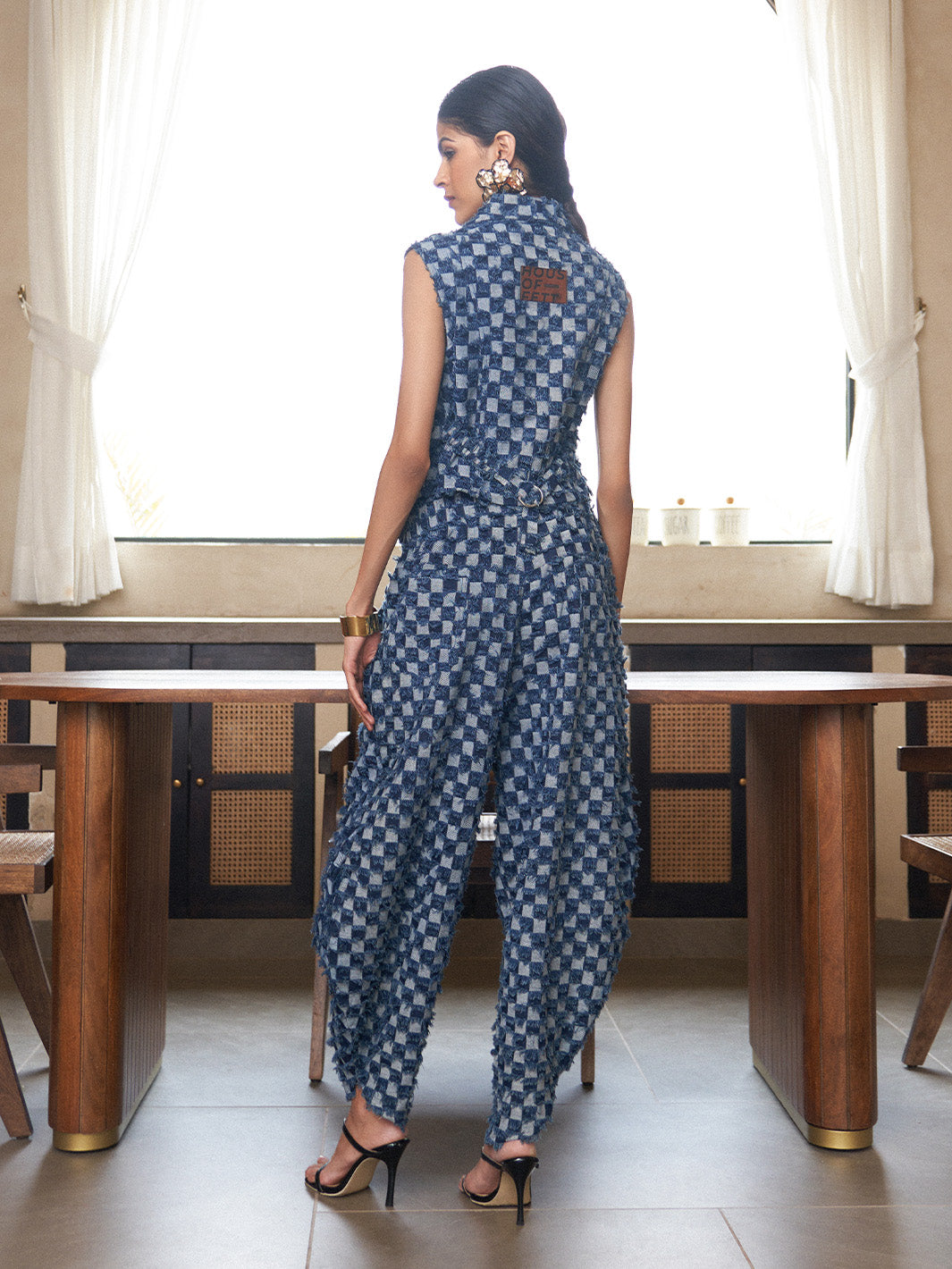 Turn heads with the Indigo Checkered Coord Set by House of Fett, a striking two-piece ensemble that combines modern tailoring with artisanal texture. The sleeveless waistcoat features a notched collar and front buttons, paired with dhoti-inspired pants that balance structure and ease. Perfect for art exhibitions, power meetings, or after-hours cocktails.