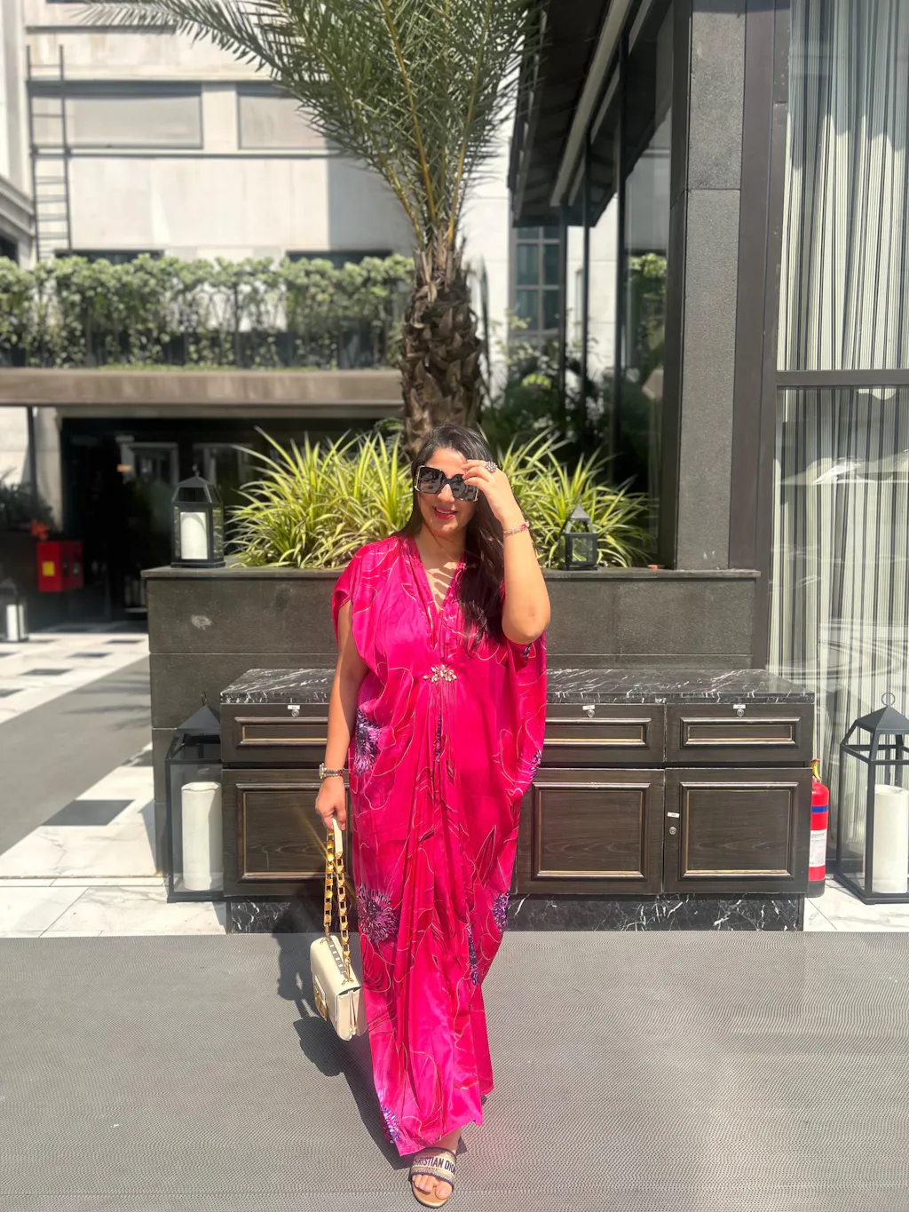 Opulent and eye-catching, this fuchsia pink kaftan is a wearable work of art. Crafted in satin with bold oversized floral prints, it features a gathered drape cinched at the waist with a hand-embroidered jewel brooch detail that adds a touch of couture-like glamour. The relaxed silhouette and wide sleeves offer effortless comfort, while the plunging V-neckline balances ease with subtle allure. Perfect for resort soirées, festive evenings, or destination weddings, this kaftan promises to flow beautifully with every step.