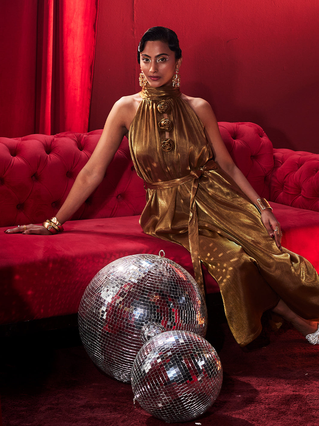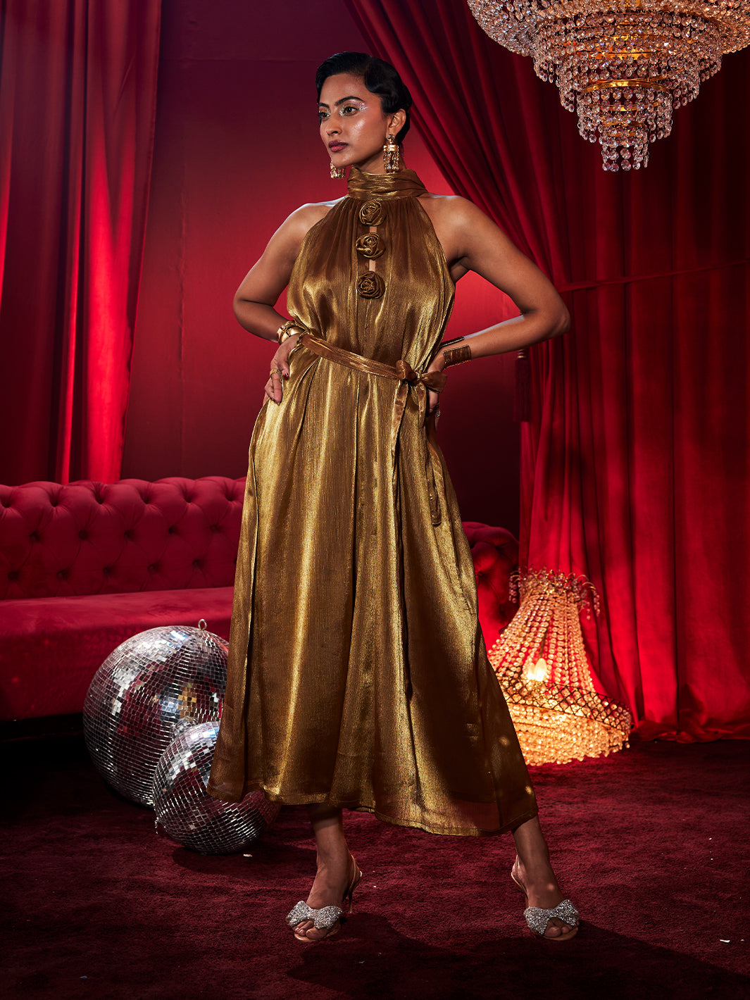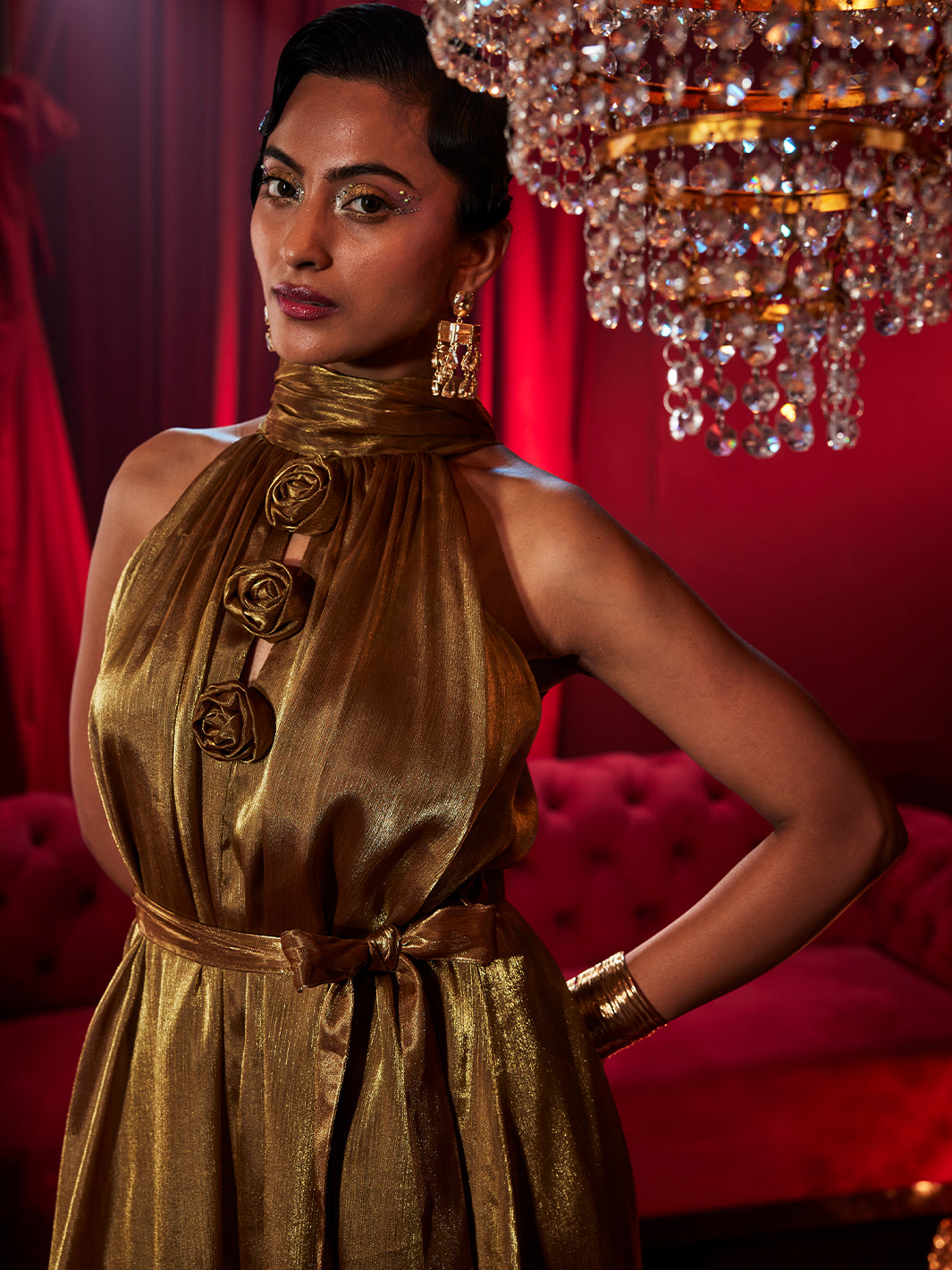 Striking and sculptural, this gold-toned jumpsuit is designed for moments that call for drama. The high halter neckline is finished with handcrafted rosette accents, adding a couture-like detail that draws the eye upward. The fluid fabric falls elegantly into a relaxed silhouette, giving it the grace of a gown with the ease of a jumpsuit. The detachable tie-up belt cinches the waist, allowing for versatile styling and a flattering, customizable fit. Featuring a concealed back zipper, this piece is perfect for cocktail soirées, red-carpet events, and glamorous evenings.