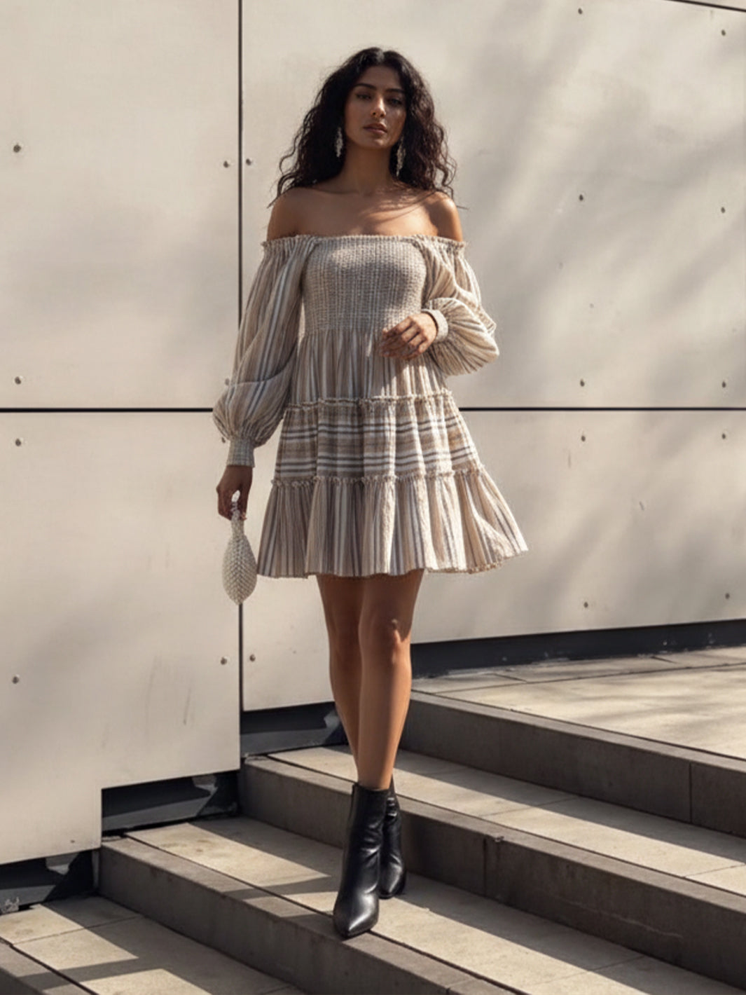 Voluminous sleeves with gathered shoulders and ruched cuffs add drama and dimension, while the flounced, tiered skirt brings a breezy, bohemian swing to your every step.